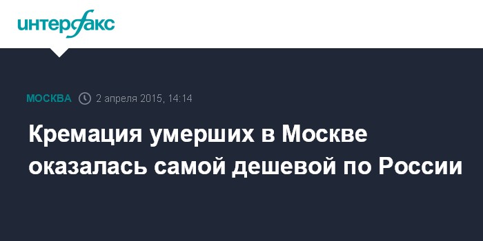 Москва. 2 апреля. INTERFAX.RU - Стоимость услуг кремации тела умершего в российской столице самая низкая среди всех регионов России, заявил руководитель ГУП "Ритуал" Артем Екимов.
