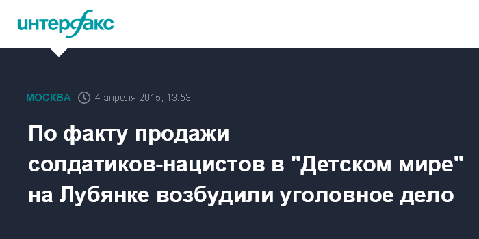 Москва. 4 апреля. INTERFAX.RU - Прокуратура Москвы добилась возбуждения уголовного дела по факту продажи в торговом центре "Центральный Детский магазин на Лубянке" бюстов и фигурок солдат и офицеров нацистской Германии, сообщила "Интерфаксу" официальный представитель столичного надзорного ведомства Елена Россохина в субботу.
