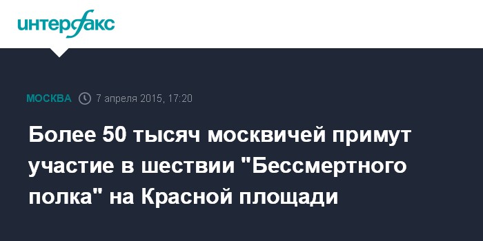 Москва. 7 апреля. INTERFAX.RU - Более 50 тысяч москвичей уже изъявили желание принять участие в шествии колонн мемориального проекта "Бессмертный полк" на Красной площади 9 мая.