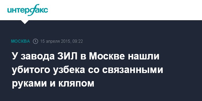 Москва. 15 апреля. INTERFAX.RU - Тело приезжего из Узбекистана со связанными руками и кляпом во рту обнаружено возле одного из зданий завода "ЗИЛ" на юге Москвы, сообщил "Интерфаксу" в среду источник в правоохранительных органах.