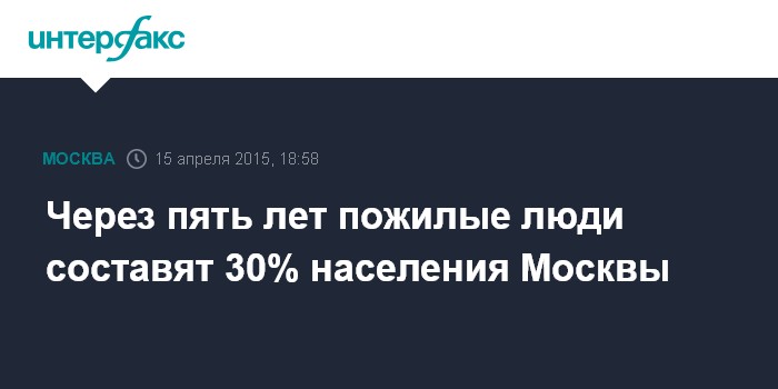 Москва. 15 апреля. INTERFAX.RU - Главный гериатр Москвы Ольга Ткачева прогнозирует, что через пять лет пенсионеры будут составлять немногим менее трети населения столицы.