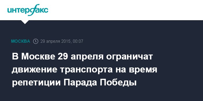 Москва. 29 апреля. INTERFAX.RU - На время репетиций и проведения парада в честь 70-летия окончания Великой Отечественной войны в Москве будет ограничено движение автомобилей.