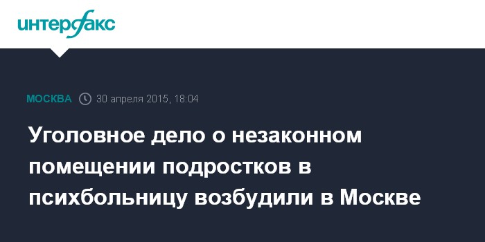 "В целях объективного и всестороннего изучения информации о незаконном помещении несовершеннолетних в стационар государственной психиатрической больницы № 15, возбуждено уголовное дело по ст. 128 УК РФ (незаконная госпитализация в психиатрическую клинику)", - сказала Иванова в четверг "Интерфаксу".