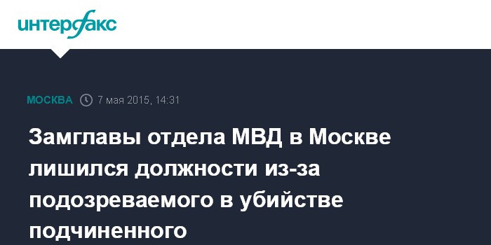Москва. 7 мая. INTERFAX.RU - Замначальника отдела МВД Фили-Давыдково в Москве освобожден от должности после задержания его подчиненного по подозрению в убийстве, сообщили "Интерфаксу" в пресс-службе столичного главка полиции.