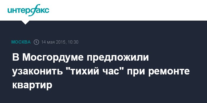 "Вопрос о дополнительных временных ограничениях на шумные работы при ремонтах жилья обсуждался профильной комиссии еще в конце апреля, однако ряд депутатов выступали против так называемого "тихого часа" (с 13:00 до 15:00), так как в это время большинство горожан находятся на работе. В законопроекте, внесенном в думу, решено оставить "тихий час", - добавил собеседник "Интерфакса".