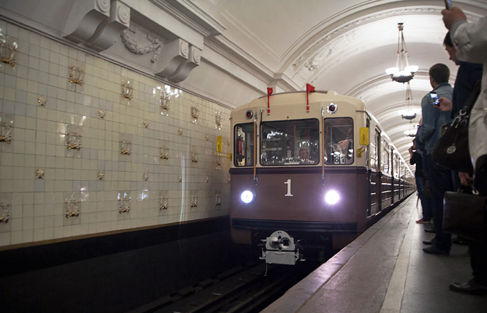 Первой звездой парада стал "Ретропоезд", который воспроизводит интерьер самых первых вагонов метро: мягкие диваны, теплый приглушенный свет. Салон ностальгического поезда облицован формованным пластиком, имитирующим линкруст - материал, применявшийся в последний раз в московских поездах метро образца 1969 года.