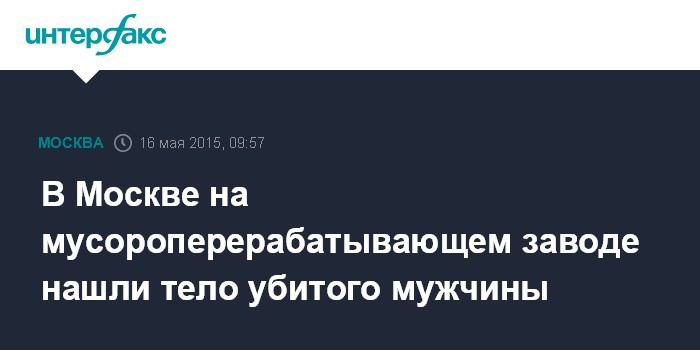 Москва. 16 мая. INTERFAX.RU - Тело мужчины со следами насильственной смерти обнаружено на мусороперерабатывающем заводе, на юге столицы в куче мусора, сообщил "Интерфаксу" источник в правоохранительных органах.