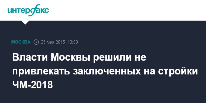 "В Москве строительство спортивных объектов к чемпионату мира по футболу в 2018 году идет опережающими темпами. Кроме того, спортивные объекты - сложные, требуют высокой квалификации рабочего персонала. Это также накладывает определенные ограничения на использование труда осужденных", - сказал Хуснуллин в понедельник "Интерфаксу".