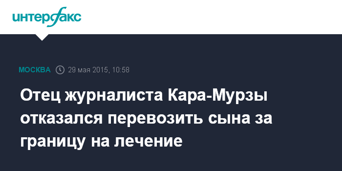 Москва. 29 мая. INTERFAX.RU –Владимир Кара-Мурза младший, госпитализированный с диагнозом "острая почечная недостаточность", не будет транспортироваться за границу для лечения, заявил отец журналиста Владимир Кара-Мурза старший.