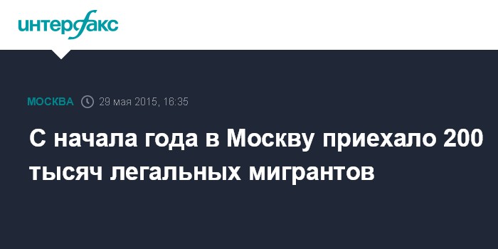Москва. 29 мая. INTERFAX.RU - Количество мигрантов в Москве не уменьшилось по сравнению с предыдущими годами, с начала года зарегистрировано около 200 тысяч легальных приезжих, сообщил мэр столицы Сергей Собянин в интервью федеральным телеканалам в пятницу.