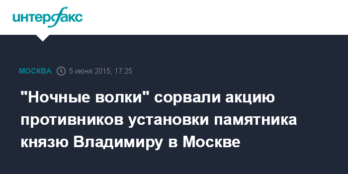 Москва. 5 июня. INTERFAX.RU - На Воробьевых горах в Москве в пятницу прошли акции противников и сторонников установки там памятника святому князю Владимиру. В акции приняли участие члены байк-клуба "Ночные волки", которые не дали протестующим развернуть плакаты и провели с ними "профилактическую беседу".