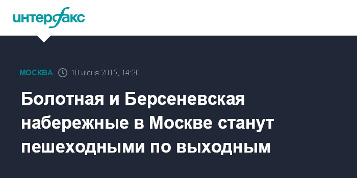 Москва. 10 июня. INTERFAX.RU - Болотная и Берсеневская набережные, а также Берсеневской переулок в Москве с 12 июня станут пешеходными по выходным и праздничным дням. Об этом сообщает M24.ru со ссылкой на главу Центра организации дорожного движения (ЦОДД) Вадима Юрьева.