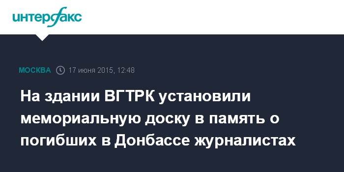 Москва. 17 июня. INTERFAX.RU - Мемориальная доска в память об убитых на востоке Украины журналистах ВГТРК Игоре Корнелюке и Антоне Волошине появилась в Москве.
