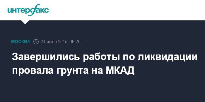 Москва. 21 июня. INTERFAX.RU - Городские службы завершили работы по ликвидации провала грунта на южном участке МКАД, сообщил пресс-секретарь заместителя мэра столицы по вопросам ЖКХ и благоустройства Игорь Пергаменщик "Интерфаксу" в воскресенье.
