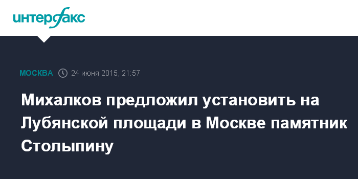 "Лубянская площадь - идеальное место для памятника Столыпину", - заявил Михалков журналистам в ответ на вопрос о его отношении к возможному возвращению памятника Дзержинскому на прежнее место, на Лубянскую площадь.