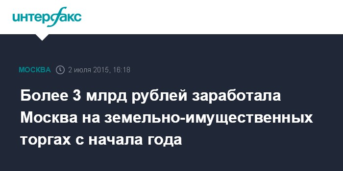 Москва. 2 июля. INTERFAX.RU - По итогам первой половины 2015 года земельно-имущественные торги принесли в бюджет Москвы 3,2 млрд рублей, сообщил "Интерфаксу" руководитель столичного департамента по конкурентной политике Геннадий Дегтев.