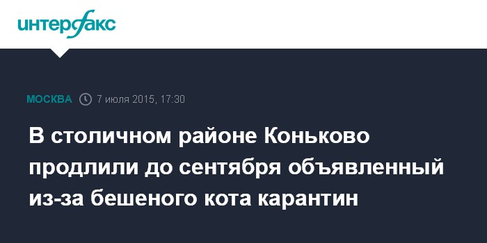 3 июля, источник в городской администрации сообщил "Интерфаксу", что мэр столицы Сергей Собянин подписал распоряжение об установлении карантина на территории района Коньково на юго-западе Москвы до 2 сентября 2015 года. "Карантин объявлен в связи с выявлением 1 июля случая заболевания бешенством домашнего животного на территории района", - сказал собеседник агентства.
