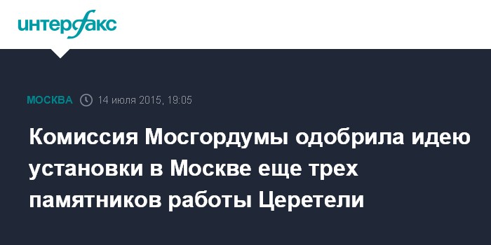 Москва. 14 июля. INTERFAX.RU - Комиссия по монументальному искусству при Мосгордуме одобрила инициативу установки в Москве трех новых памятников работы президента Российской академии художеств, известного скульптора Зураба Церетели.