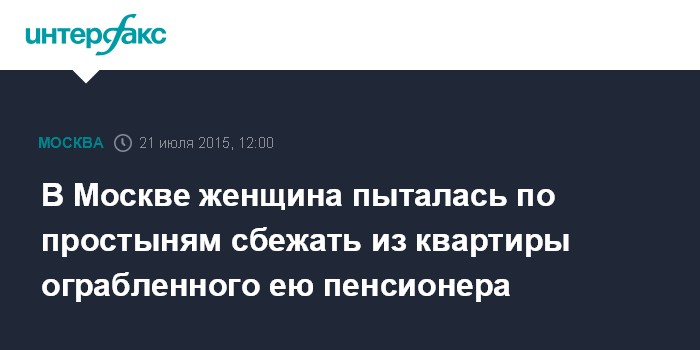 Москва. 21 июля. INTERFAX.RU - Московский пенсионер сумел запереть в своей квартире женщину, пытавшуюся похитить его сбережения, а когда та попыталась спуститься на улицу по простыням, ее задержали сотрудники полиции.
