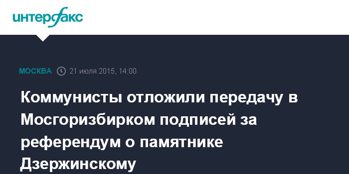 Москва. 21 июля. INTERFAX.RU - - Зампред ЦК КПРФ, руководитель московского горкома партии Валерий Рашкин заявил, что инициативная группа по сбору подписей, необходимых для проведения референдума о восстановлении памятника Дзержинскому на Лубянке, решила отложить сдачу подписей в Мосгоризбирком.