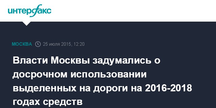 Москва. 25 июля. INTERFAX.RU -Средства, выделенные на дорожное строительство на 2016-2018 годы, могут быть использованы раньше из-за ускоренных темпов работы, сообщил журналистам в ходе субботнего объезда заместитель мэра Москвы по вопросам градостроительной политики и строительства Марат Хуснуллин.
