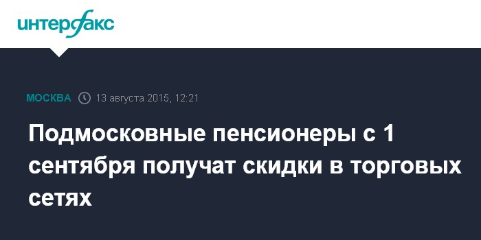 Москва. 13 августа. INTERFAX.RU - Подмосковные пенсионеры с начала осени смогут получать 5% скидку на продукты в крупных торговых сетях в Московской области, сообщил министр потребительского рынка и услуг региона Владимир Посаженников.