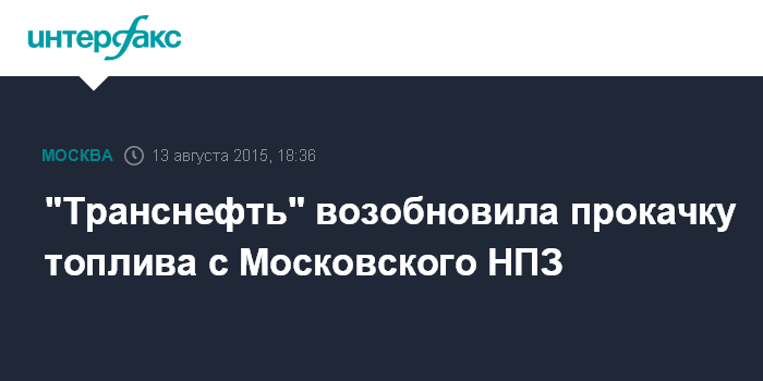 Москва. 13 августа. INTERFAX.RU - АК "Транснефть" возобновила прокачку авиакеросина и дизельного топлива по нефтепродуктопроводу, ведущему от "Московского НПЗ", сообщил Агентству нефтяной информации (АНИ) советник президента компании, пресс-секретарь Игорь Демин.