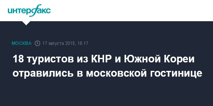 Москва. 17 августа. INTERFAX.RU - Массовое отравление туристов из Китая и Южной Кореи произошло в отеле на востоке Москвы, госпитализированы 18 человек, сообщил "Интерфаксу" источник в медицинских кругах столицы.