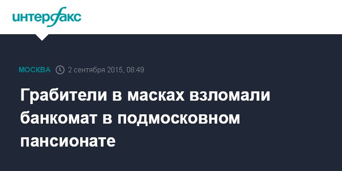 Москва. 2 сентября. INTERFAX.RU - Пятеро неизвестных забрали более 1,7 млн рублей из банкомата в культурно-спортивном центре пансионата "Заря" в Ступинском районе Московской области, сообщили в среду "Интерфаксу" в пресс-центре МВД РФ.