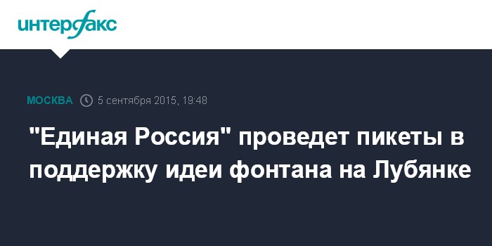 Москва. 5 сентября. INTERFAX.RU - До конца сентября "Единая Россия" проведет 1700 пикетов в поддержку установки фонтана на Лубянской площади, она предлагает не политизировать этот вопрос, сообщила пресс-служба партии.