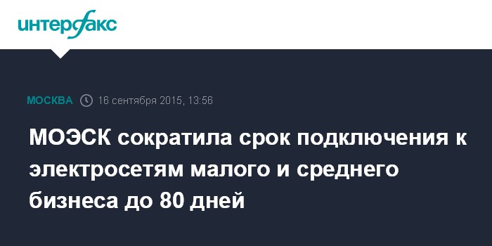 Москва. 16 сентября. INTERFAX.RU - Срок техприсоединения к электросетям в столичном регионе объектов малого и среднего бизнеса с заявленной мощностью от 15 до 150 кВт сокращен до 80 дней, сообщил директор по техприсоединению и развитию услуг ПАО "Московская объединенная электросетевая компания" (МОЭСК) Гудиса Сакания.