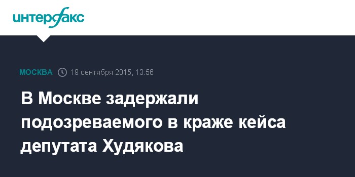 Москва. 19 сентября. INTERFAX.RU - Задержан мужчина, подозреваемый в краже дипломата с деньгами из автомобиля депутата Госдумы Романа Худякова, сообщил начальник пресс-службы столичной полиции Андрей Галиакберов в субботу.