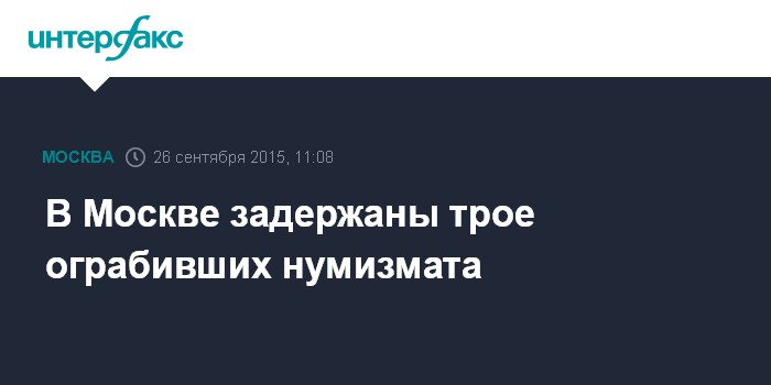 Москва. 26 сентября. INTERFAX.RU - Столичные полицейские задержали троих мужчин, которые подозреваются в том, что дважды за год ограбили одного и того же пенсионера-нумизмата, сообщил "Интерфаксу" в субботу начальник пресс-службы столичной полиции Андрей Галиакберов.