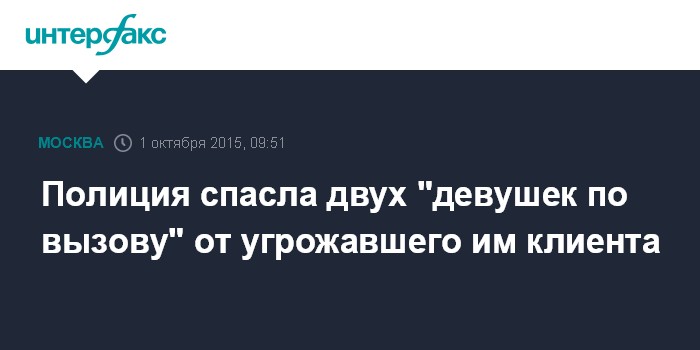 Москва. 1 октября. INTERFAX.RU - Сотрудники московской полиции вызволили двух "девушек по вызову", которым клиент угрожал ножом, заперев в квартире на юге Москвы, сообщил "Интерфаксу" в четверг начальник пресс-службы столичного ГУ МВД Андрей Галиакберов.
