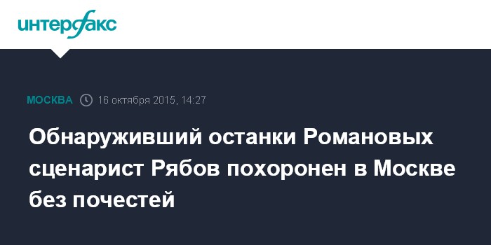 Москва. 16 октября. INTERFAX.RU - Инициатор возобновления расследования обстоятельств убийства царской семьи, советский литератор и сценарист Гелий Рябов, скончавшийся в среду, похоронен без почестей на Митинском кладбище в Москве, сообщил старший следователь-криминалист СКР Владимир Соловьев в пятницу "Интерфаксу".