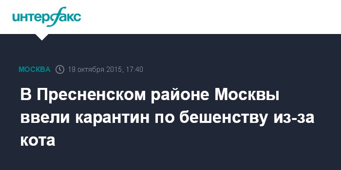 Москва. 19 октября. INTERFAX.RU - Мэр Москвы Сергей Собянин ввел в Пресненском районе столицы карантин до 15 декабря из-за случая бешенства кота, сообщает в понедельник управление Роспотребнадзора по Москве.