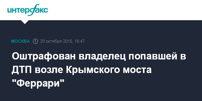 Москва. 20 октября. INTERFAX.RU - Мужчина, передавший управление своей "Феррари" виновнику ДТП в центре Москвы, оштрафован на 30 тысяч рублей. Об этом сообщил "Интерфаксу" во вторник руководитель пресс-службы столичного главка полиции Андрей Галиакберов.