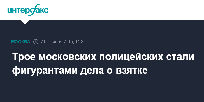 Москва. 24 октября. INTERFAX.RU - Трое полицейских и их посредник задержаны в столице по подозрению в получении взятки в размере 2,5 млн рублей, сообщила официальный представитель управления СК РФ по Москве Юлия Иванова.