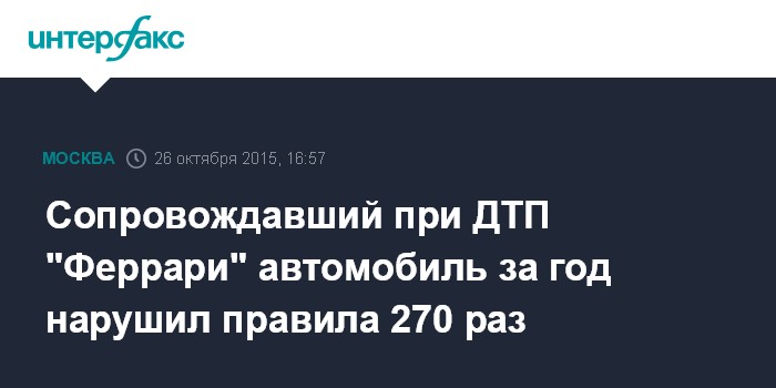 Москва. 26 октября. INTERFAX.RU - Автомобиль, сопровождавший водителя "Феррари", устроившего ДТП в Москве, с начала года более 270 раз нарушал правила дорожного движения, сообщил глава пресс-службы столичного главка полиции Андрей Галиакберов "Интерфаксу" в понедельник.