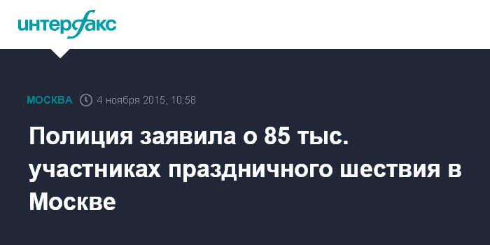 Москва. 4 ноября. INTERFAX.RU - В шествии по случаю Дня народного единства в центре Москвы принимают участие около 85 тысяч человек, сообщает пресс-служба ГУ МВД РФ по Москве.