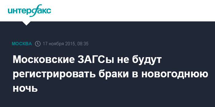 Москва. 17 ноября. INTERFAX.RU - Опубликованная в некоторых СМИ информация о том, что столичные ЗАГСы готовы предложить молодоженам регистрацию брака в новогоднюю ночь, не соответствует действительности, заявили "Интерфаксу" в ведомстве во вторник