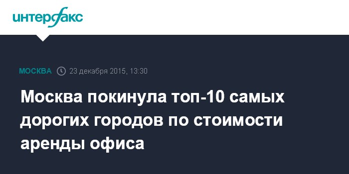 "По итогам 2015 года Москва покинула рейтинг десяти самых дорогих городов мира, переместившись на 11 место, хотя еще в конце 2014 года Москва входила в топ-5. Столь стремительное падение в рейтинге не удивительно: в течение 2015 года ставки аренды на офисные помещения в сегменте класса "А Прайм" уменьшились на 10%, а относительно начала 2014 года - на 15-25%", - отметила руководитель отдела исследований рынка офисных помещений CBRE Клавдия Чистова.