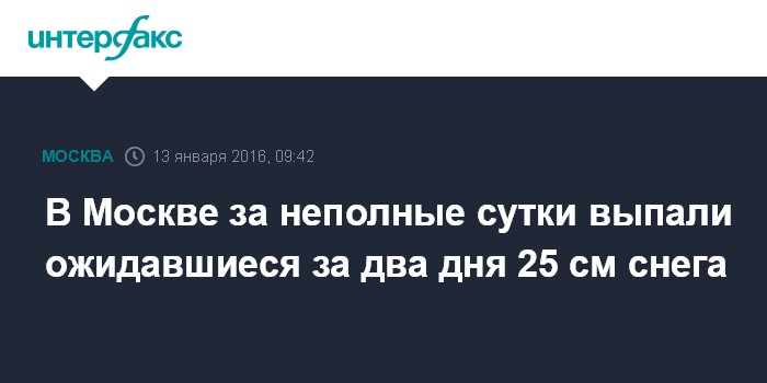 Москва. 13 января. INTERFAX.RU - С начала сильного снегопада, который начался в Москве днем во вторник, в городе местами выпало до 24 см снега, сообщил "Интерфаксу" пресс-секретарь заместителя мэра столицы по вопросам ЖКХ и благоустройства Игорь Пергаменщик в среду.