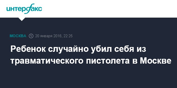 Москва. 20 января. INTERFAX.RU - Ребенок одиннадцати лет случайно выстрелил в себя из травматического пистолета и скончался из-за пули, попавшей в голову, сообщила "Интерфаксу" в среду официальный представитель ГСУ СК России по столице Юлия Иванова.