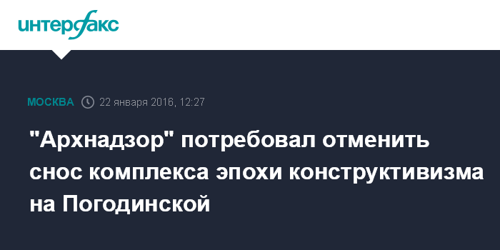 Москва. 22 января. INTERFAX.RU - Общественное движение "Архнадзор" требует отзыва ордера на снос комплекса эпохи конструктивизма "Погодинская" в центре Москвы, говорится в сообщении организации.