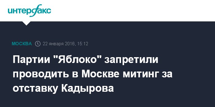 Москва. 22 января. INTERFAX.RU - Активистам партии "Яблоко" запретили проводить акцию с требованием отставки главы Чеченской республики Рамзана Кадырова в Москве. Об этом со ссылкой на префектуру ЦАО говорится в сообщении на сайте партии.
