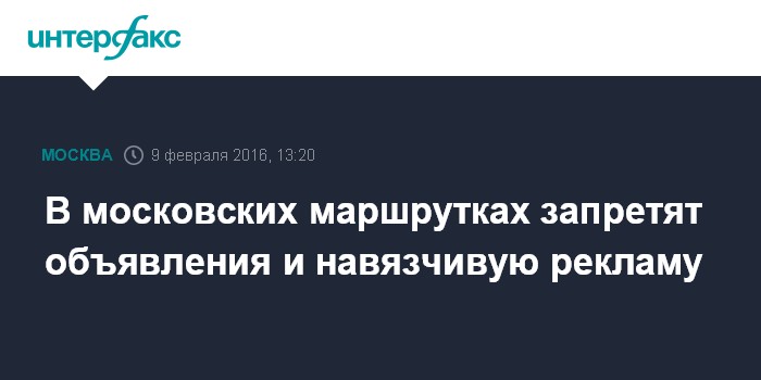 Москва. 9 февраля. INTERFAX.RU - В маршрутках Москвы запретят размещать нерегламентированные надписи, объявления и навязчивую рекламу. Об этом сообщается на сайте столичного департамента транспорта и развития дорожно-транспортной инфраструктуры.
