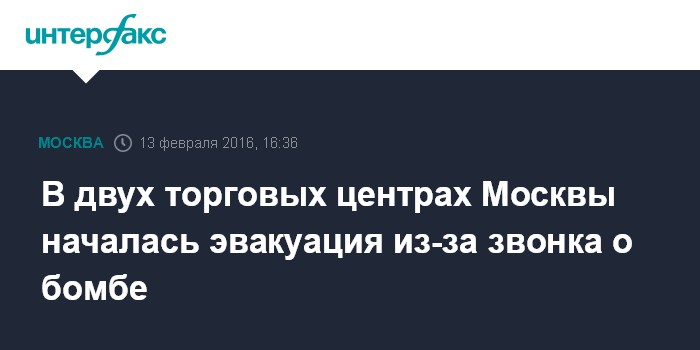 Москва. 13 февраля. INTERFAX.RU - Два крупных торговых центра эвакуируют в центре Москвы из-за звонка о заложенной бомбе, сообщил "Интерфаксу" источник в правоохранительных органах.