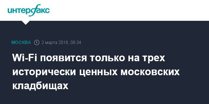Москва. 2 марта. INTERFAX.RU - Беспроводной интернет появится не на всех московских кладбищах, а только на тех, которые имеют культурологическую ценность, сообщил глава департамента торговли и услуг Алексей Немерюк интервью изданию "Газета.ру".