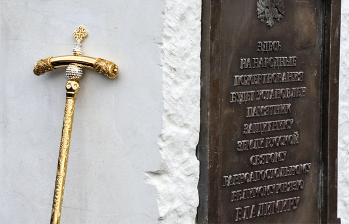 Освящение закладного камня в основание памятника 3 ноября 2015 года совершил патриарх Московский и всея Руси Кирилл. В церемонии также участвовали глава РВИО, министр культуры РФ Владимир Мединский, мэр Москвы Сергей Собянин. Закладка была приурочена, в том числе, к 1000-летию преставления князя Владимира.